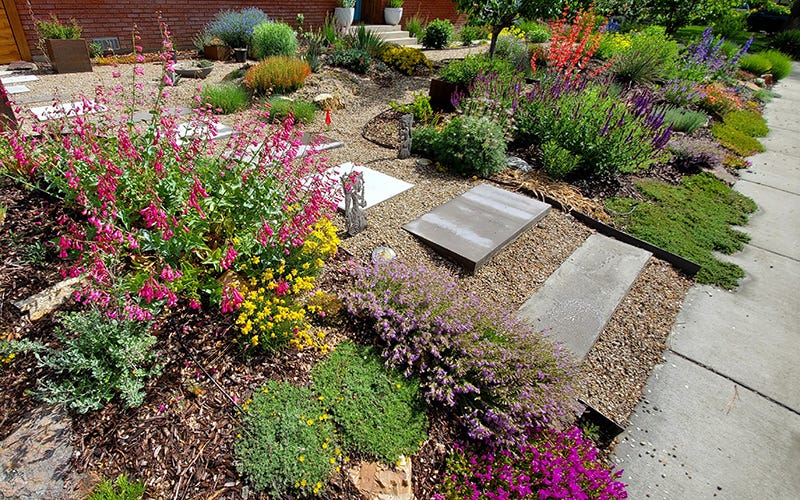 With the goals of saving water and supporting pollinators, Matthew and Pascale replaced their entire front yard with colorful flowers, groundcovers, and ornamental grasses, for a new front yard with curb appeal and personality.